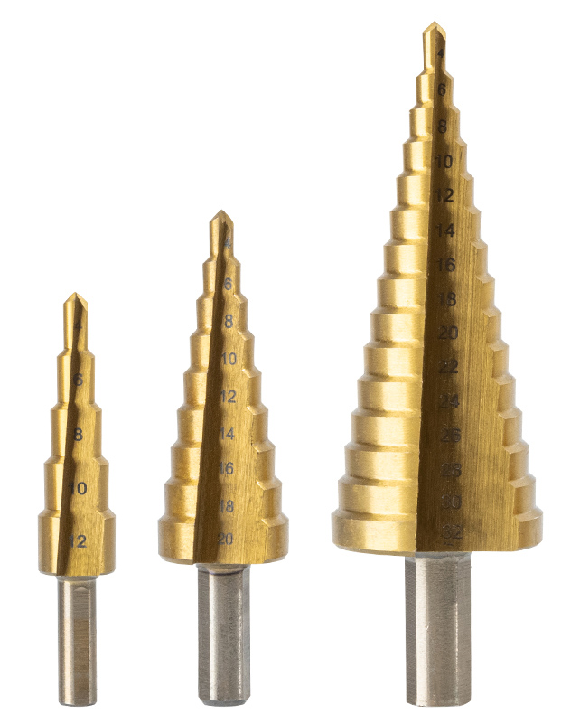 Σετ κωνικά τρυπάνια της DELI κατάλληλα για χρήση σε μεταλλικές επιφάνειες. Είναι κατασκευασμένα από χάλυβα υψηλής ταχύτητας (HSS) και διαθέτουν βαθμίδες διαφορετικής διαμέτρου. Η συσκευασία περιλαμβάνει 3 κωνικά τρυπάνια διαφορετικού μεγέθους.